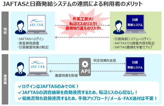 また、JAFTASで一定の品質が確保された内容が日商発給システムに連携されることで、日本商工会議所の判定審査担当者が行う申請内容のチェックなど、判定審査作業にかかる工数やリードタイムの削減も可能となります。