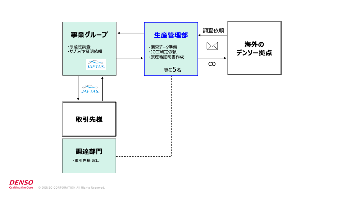 スズキ様ではEPA業務を1つの部署に集約して行っていますが、デンソー様では、生産管理部が業務の取りまとめをしつつも、各製品の事業グループにて原産資格調査を行っているとお伺いし、興味深いです。現在の体制となった経緯を教えていただけますか?